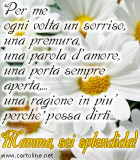 Lettera alla mamma: più di 45 emozionanti lettere ... Lettera alla mamma. Una lettera ad una mamma speciale è un modo molto carino per dimostrarle il nostro affetto. Le mamme si stupiscono e si commuovono quando leggono una lettera di una figlia alla mamma, ma anche di un figlio.Ecco allora tanti spunti per delle lettere dolci per la mamma.. Carissima mamma, ti scrivo questa lettera senza un motivo in particolare. LETTERA A MIA MAMMA ( UNA FIGLIA) - Meravigliosa da leggere Lettera a mia mamma: A te, che sei capace di affrontare la vita grazie alla forza che spesso a me manca. A te che sei sempre dalla mia parte, nonostante i difetti che ho e la mia testa che spesso non ti ascolta. Per te, che dopo ogni sconfitta ritrovo, che sei pronta a sorreggermi, dandomi la forza di risalire e risollevarmi ogni volta. Lettera a mio figlio in occasione della giornata della ... Mentre guardo mio figlio dormire gli scrivo questa lettera che volevo condividere con tutte voi mamme e donne. A mio figlio: Questi sono i giorni contro la violenza sulle Donne e oggi più che mai il mio impegno di madre di un maschietto si concentra. Ti prometto che ti aiuterò a capire che uomo e donna sono diversi, ma perfettamente compatibili. bellissima lettera di una madre a sua figlia Il senso di queste parole nella lettera di una madre a suo figlio. In questa lettera di una madre qualsiasi, vediamo trionfare e consolidare lâ amore di due giovani attraverso il matrimonio, ma in essa emerge anche un altro tipo di amore, quello per la propria figlia ormai cresciuta. Ed è in quel momento che bisogna scegliere.