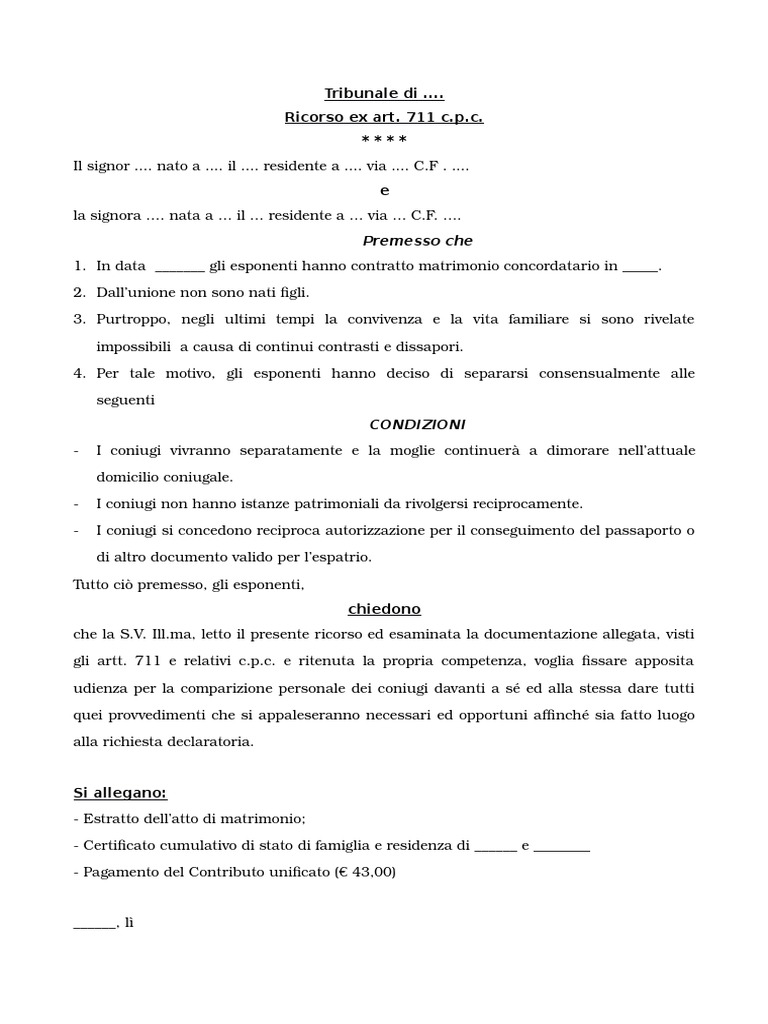 Fac simile lettera richiesta congedo matrimoniale | Soldioggi Di seguito un fac simile lettera richiesta congedo matrimoniale da utilizzare come modello da compilare con i propri dati. Questo modulo di domanda, compilato con i nostri dati, può essere consegnato a mano oppure spedito con raccomandata A/R all'ufficio del personale. FAC SIMILE RICHIESTA LICENZA MATRIMONIALE Nostro nome e cognome Via Cap Città Qual e il modello di lettera di separazione o divorzio? Dunque la lettera di separazione che l'avvocato invia non appena ricevuto il mandato dal proprio cliente è rivolta a incentivare un accordo per procedere alla separazione consensuale. La quale, oltre a far risparmiare costi e tempi alle parti, ha un altro vantaggio: consente di avviare le carte per il divorzio dopo solo 6 mesi . Accordo di Separazione - Modello, Fac-Simile Word e PDF Compila il modello Nomi alternativi per il documento: accordo di separazione davanti a pubblico ufficiale, separazione davanti a pubblico ufficiale, separazione in comune, patto di separazione, convenzione di separazione Stato: Italia Vita familiare, matrimoni, divorzi - Altri modelli di documenti giuridici da scaricare