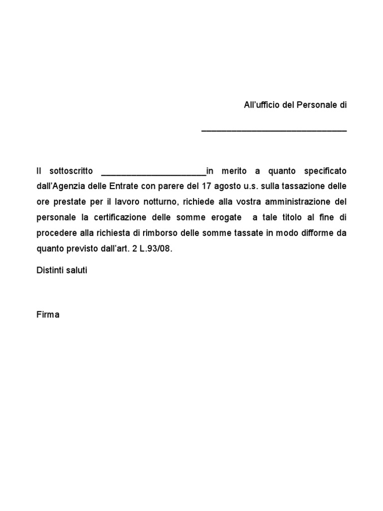 Modello Comunicazione Lavoro Notturno Di seguito si trova il modello comunicazione lavoro notturno editabile e compilabile editabile da scaricare sul proprio computer. Una volta che il documento è stato scaricato, bisogna aprirlo con un programma che supporta i file in formato Word e compilarlo inserendo quelli che sono i dati richiesti.